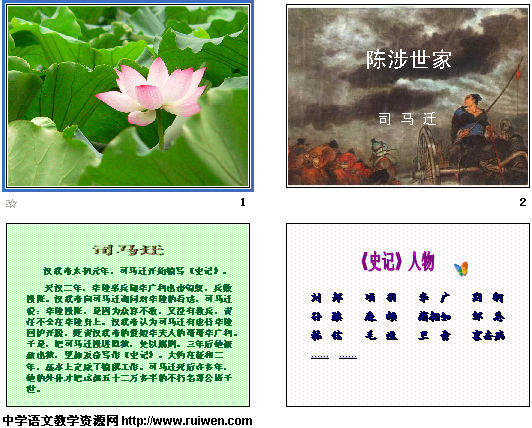 课件简介:ppt制作,改编课件, 陈涉世家主要叙述陈涉、吴广领导的第一次农民起义的经过和起义军初期的迅猛发展形式,属于传记体裁。. 上传者:hkys2004