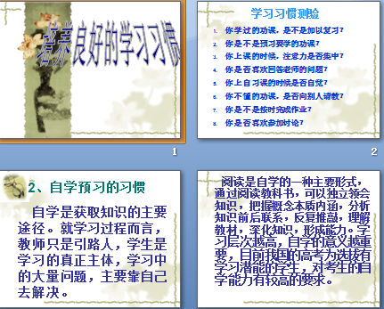 课件简介:ppt制作,转发课件, 学习习惯测验你学过的功课,是不是加以复习?你是不是预习要学的功课?你上课的时候,注意力是否集中?你是否喜欢回答老师的问题?你上自习课的时候是否自觉?你不懂的功课,是否向别人请教?你是不是按时完成作业?你是否喜欢参加讨论?. 上传者:iceleaf