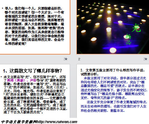 课件简介:ppt制作,原创课件, 阅读《光》,探究以下问题:
