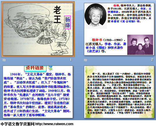 课件简介:ppt制作,原创课件, 文章作于1984年,作者记叙了自己当时在“文化大革命”时期同老王交往中的几个片段,也是因为就在那个时期老王对作者一家的种种深深地印刻在了作者的脑海之中……. 上传者:yyz627