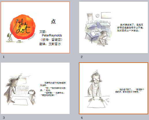 课件简介:ppt制作,转发课件,给本《点》 美术课结束了,但是瓦斯蒂还是黏在椅子上不走,她的画纸上一片空白。斯蒂的老师俯身去看那张白纸。“啊!一场雪暴中的北极熊,”她说。“真滑稽!”瓦斯蒂说。“我压根就没画!” 上传者:2001bear