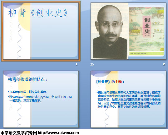 课件简介:苏教版语文中考复习总复习柳青《创业史》 ppt原创课件,通过描写梁家父子两代人不同的创业道路,概括了中国农民的生活历程和内在愿望。通过对合作化前后各阶级、阶层人物之间复杂关系与尖锐斗争的描写,展现了农村社会主义改造的过程和农民群众精神世界的巨变。具有史诗性的特点和规模。 上传者:yyz627