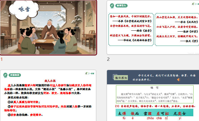 课件简介:人教版语文七年级上册8《世说新语》二则-咏雪 课件 ppt改编课件,了解《世说新语》的相关知识,积累常见的文言词语,借助注释疏通文意,用自己的话讲述故事,感知古今汉语的差别。学习课文写景状物以及运用语言描写和神态描写刻画人物形象的方法,感受古人的家庭生活情趣和文化修养。 上传者:azheng