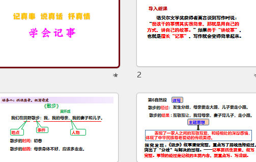 课件简介:人教版语文七年级上册《学会记事》 ppt改编课件,把事情写清楚,写出事情的起因、经过和结果,体会并尝试在叙事中抓住细节表达感情,通过课文具体例子引领掌握习作方法。抓住具体的景物进行刻画,锤炼语言,在叙述中提升文章的美感和表达人物的情感。 上传者:azheng