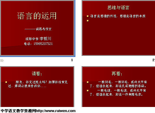 上传者:lizhechuan 邮箱:syzxjwc1963@163.com 课件简介:ppt制作,原创课件, 从作文的的角度培养学生的写作。思维与写作、思路与写作、语言的精致与粗俗,高考作文需要亮点,需要思想的正确。