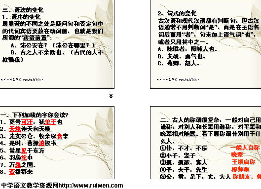 上传者:angeryboy 邮箱:angeryboy@sina.com 课件简介:ppt制作,改编课件, 语言文字选修中古今言殊的章节,内容丰富,纵览古今,给学生在古今文字对比的学习中更加易于接受