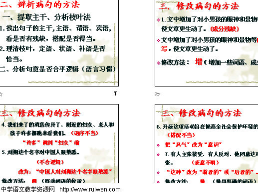 上传者:gfgfgf 邮箱:1029521896@qq.com 课件简介:ppt制作,改编课件, 病句的类型;辨析的方法;修改的方法、原则;中考连接等。