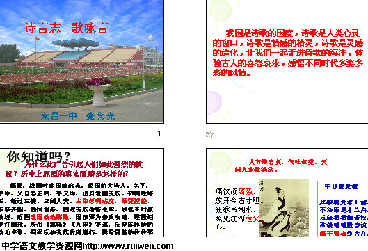 上传者:hanguang 邮箱:zhanghanguang99@tom.com 课件简介:ppt制作,原创课件, 本课件采用互动教学模式,以具体的典型诗歌作品,对“诗言志,歌咏志”两种诗歌创作思想,进行了有效的解读,有利于学生学好古代诗歌。