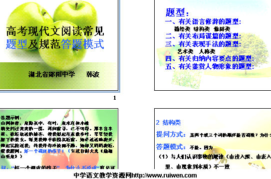 课件简介:ppt制作,原创课件, 高考现代文阅读常见题型及规范答题模式,属于稀缺课件,对现代文复习有积极意义.