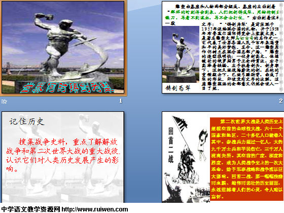 课件简介:ppt制作,改编课件, 图片展示了中国近现的著名的一些战役以及世界一些重要的战争,结合抢答题,让学生融入知识与情感的教育。. 上传者:liaoliaoxinyu 邮箱:huangyuxuan5230@sina.com.cn