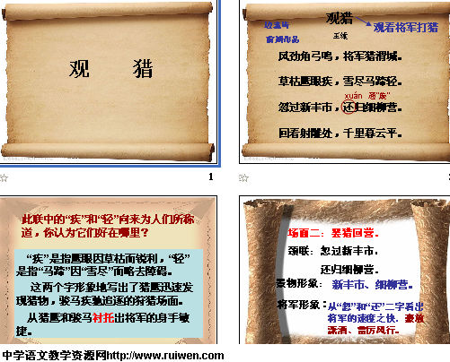 课件简介:ppt制作,改编课件, 此课件非常全面深刻、到位地解析了《观猎》的诗歌内容,是一个非常优秀的课件,希望能够得到大家的认可。. 上传者:yingfang8300 邮箱:luoyingfang83@163.com
