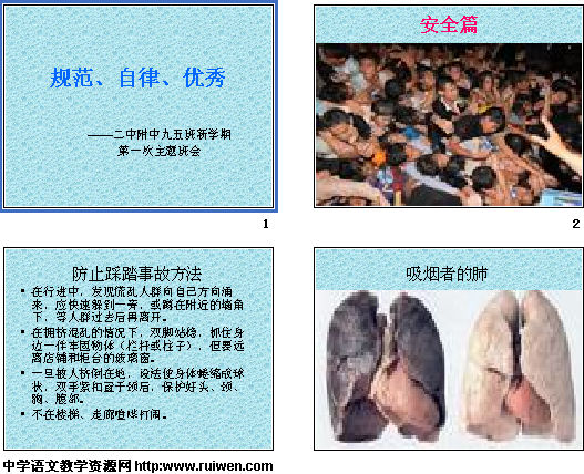 课件简介:ppt制作,原创课件, 学生进入九年级,更需用优秀规范自己、要求自己,做一个上进、积极的优秀学生,本课件从各方面规范、引导学生,很适合开学第一次班会课使用. 上传者:lvxiaona